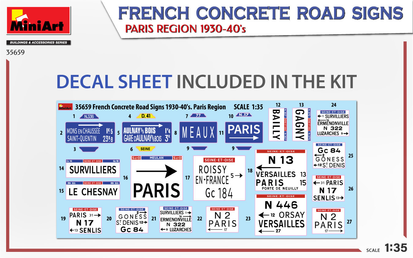 MINIART plastic kit "French Concrete Road Signs 1930/40 Paris " (cement and paints not included)